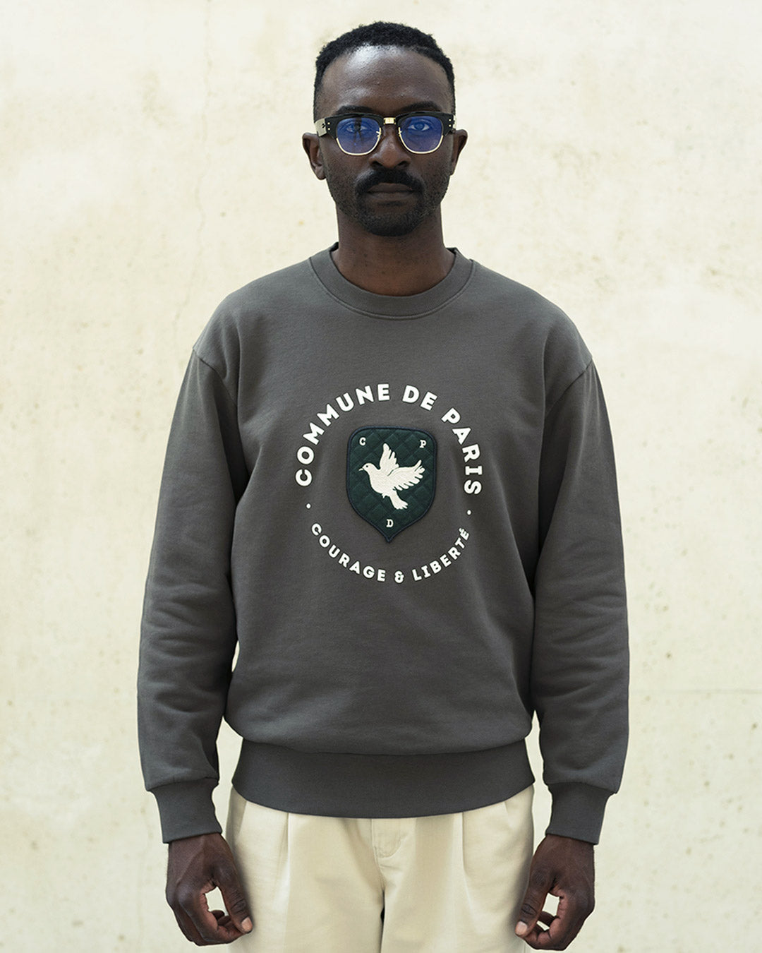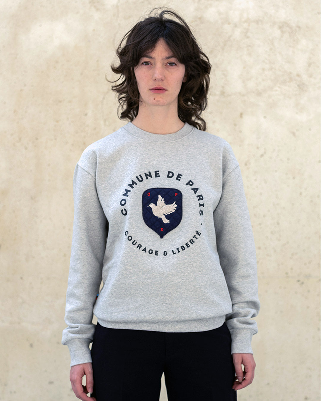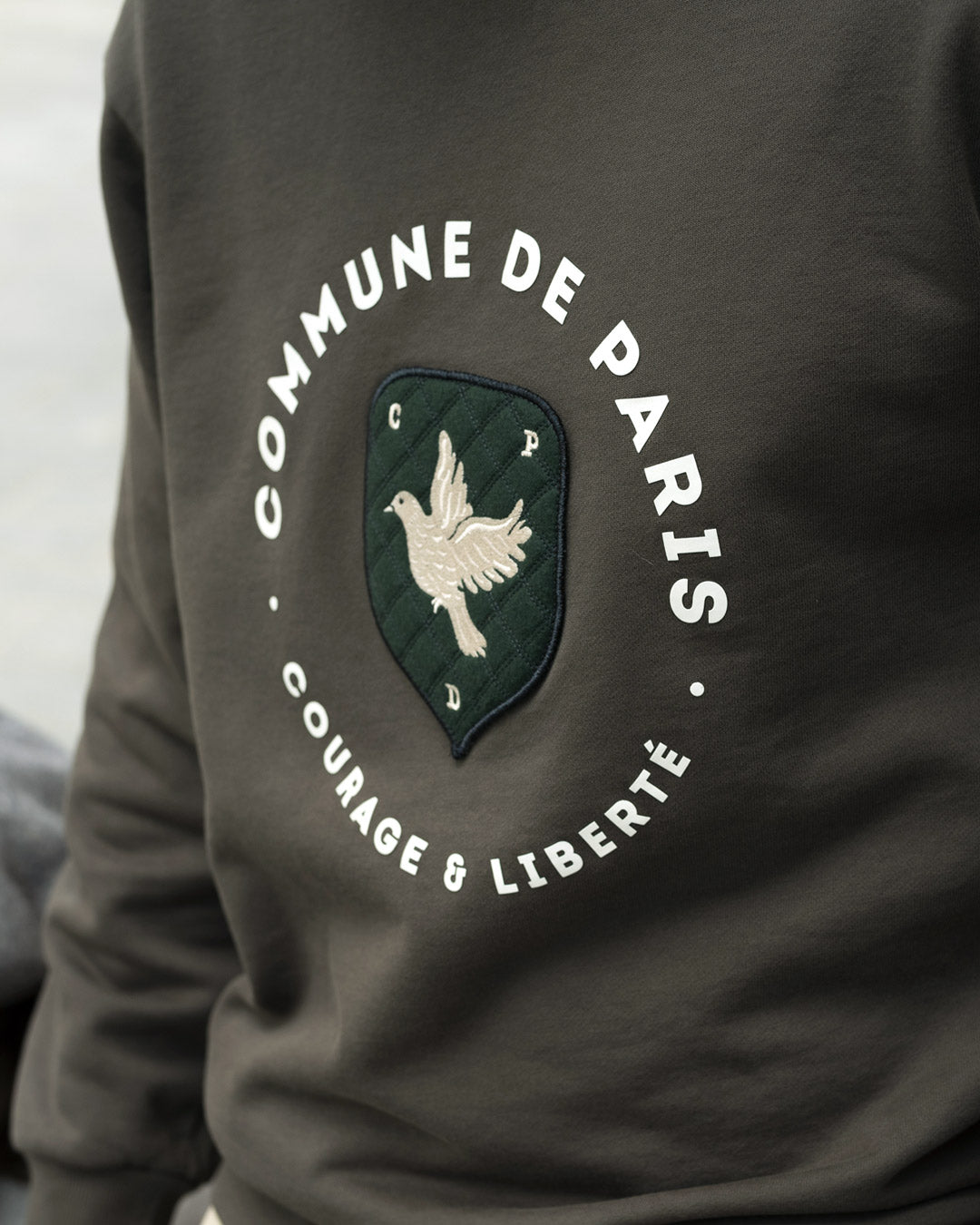 The Blason sweatshirt features it in its center: a lined felt, stitched with double thread, on which our initials and our dove stand as a symbol of peace.