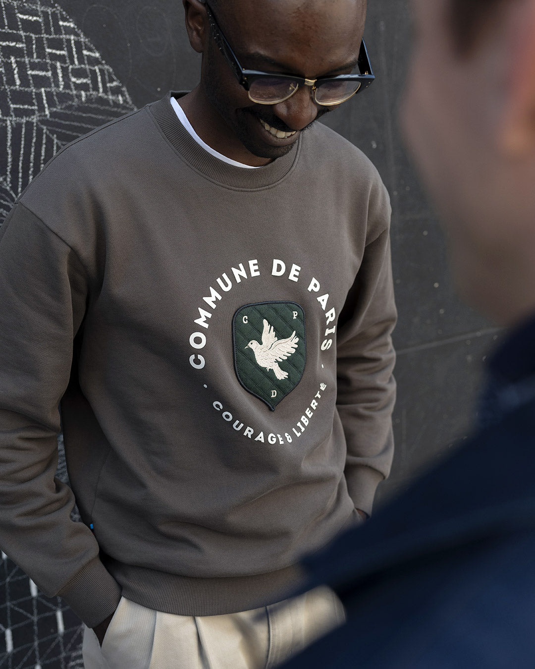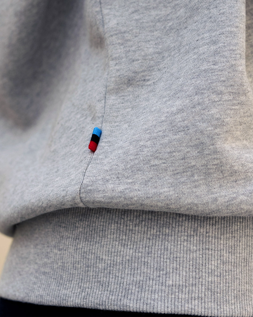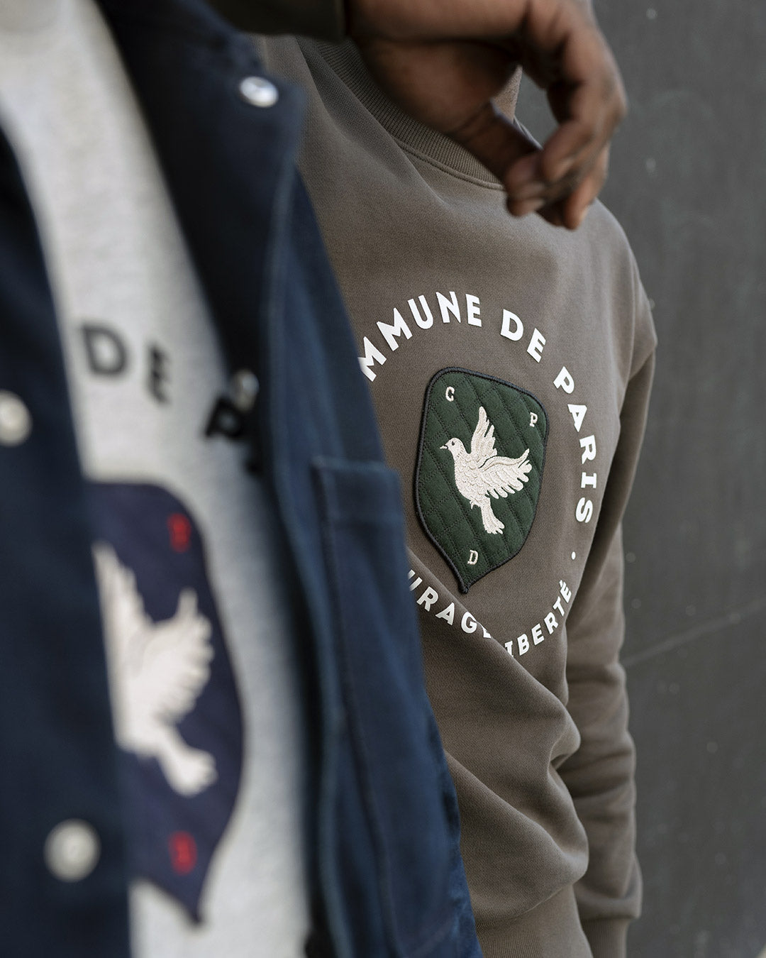 The Blason sweatshirt features it in its center: a lined felt, stitched with double thread, on which our initials and our dove stand as a symbol of peace.